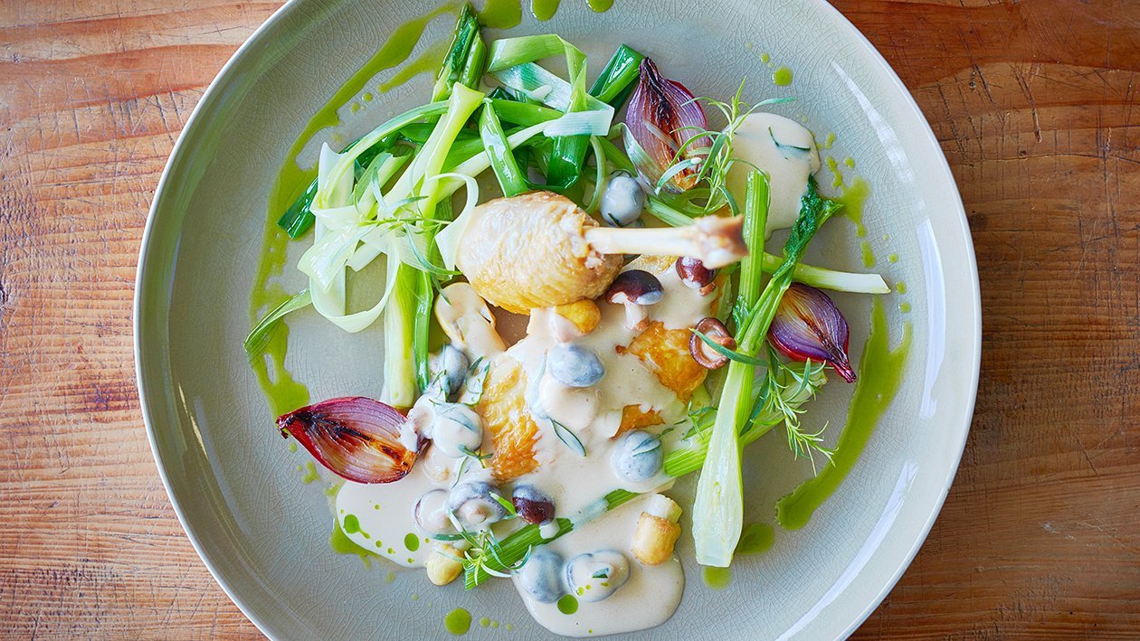 Chicken with Creamy Mushroom Sauce and Leek Oil